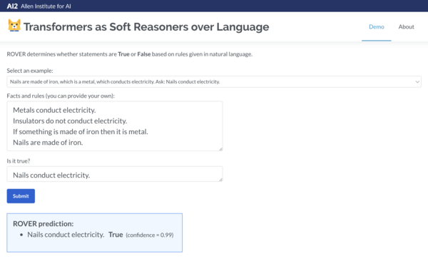 The Allen Institute for AI has an online demo of their logical reasoner called ROVER, which “determines whether statements are true or false based on rules given in natural language.” You can pick from a few pre-made sets of rules or make your own (e.g. “I like marbles. Marbles are blue.”) and give ROVER some statements to evaluate based on those rules (“I like some blue things. I like all blue things.”), and it’ll give you its best guess as to their correctness (“True” and “False,” respectively, both with 99% confidence). ROVER is capable of reasoning over much more complex rule sets, too: